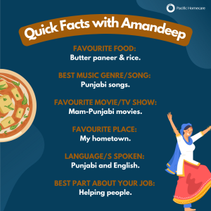 Born in the beautiful country of India, Amandeep has always had a passion for helping others. She began her journey at Pacific Homecare 7 years ago and has lived by that testament throughout her time here. Her passion has quickly shown why she has stuck by Pacific Homecare all these years saying, “They appreciate me as a worker”, mentioning her inspirations are our Service Coordinators – as they provide excellent support to her in her everyday tasks. A comment that they and Amandeep display so well.
